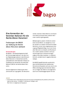 Die BAGSO fordert die Bundesregierung und die internationale Staatengemeinschaft dazu auf, die nächsten Schritte zur Verabschiedung einer Konvention zur Stärkung der Rechte Älterer einzuleiten. Ziel ist es, den rechtlichen Schutz Älterer weltweit zu stärken und damit auch ihre soziale Lage, ihre Versorgung bei Pflegebedürftigkeit und ihren Schutz vor Gewalt zu verbessern. In der Stellungnahme benennt die BAGSO zentrale Aspekte einer künftigen Vereinbarung. So sollten die nationalen Gesetzgeber dazu verpflichtet werden, ein Verbot der Diskriminierung aufgrund des Lebensalters für alle Lebensbereiche gesetzlich zu verankern.